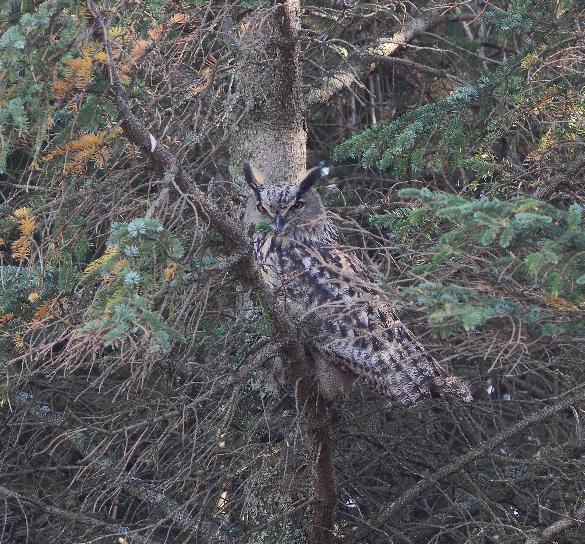 És el rapinyaire nocturn més gros del món, ja que mesura entre 29 i 73 cm del bec a la cua, i la seua envergadura alar ronda d'1,38 a 1,7 m (una mica més petit que l'àguila daurada). El seu pes oscil·la entre 1,5 i 4 kg. Les femelles són més grosses que els mascles i poden arribar a pesar tres quilos i fer més d'un metre i mig de punta a punta d'ala. Té el pit de color lleonat esquitxat de taques fosques, el dors jaspiat i fosc amb taques clares, els ulls grossos i de color taronja, i dos plomalls al cim del cap que recorden ben bé unes "orelles", tot i que no tenen res a veure amb el sentit de l'oïda (el mascle té el plomissol d'aquestes "orelles" més eriçat que la femella).La muda postnupcial és parcial, canviant anyalment part de les plomes del cos i part de les cobertores de l'ala. Les plomes de vol triguen diversos anys (entre 6 i 12) a ser renovades totes, canviant-ne entre cinc i nou cada any i estenent-se el període de muda des del juny fins a l'octubre. La muda postjuvenil dura quatre anys: les plomes corporals i part de les cobertores de l'ala es canvien en el seu primer any, però no les cobertores primàries ni les plomes de vol ni les de la cua; durant el segon any, canvia tres de secundàries centrals i el parell central de les plomes de la cua; al tercer any canvia entre dues i tres de primàries i les cobertores; durant el quart any acaba de canviar totes les secundàries i primàries juvenils amb les cobertores i el període de muda discorre des del maig fins a l'octubre.