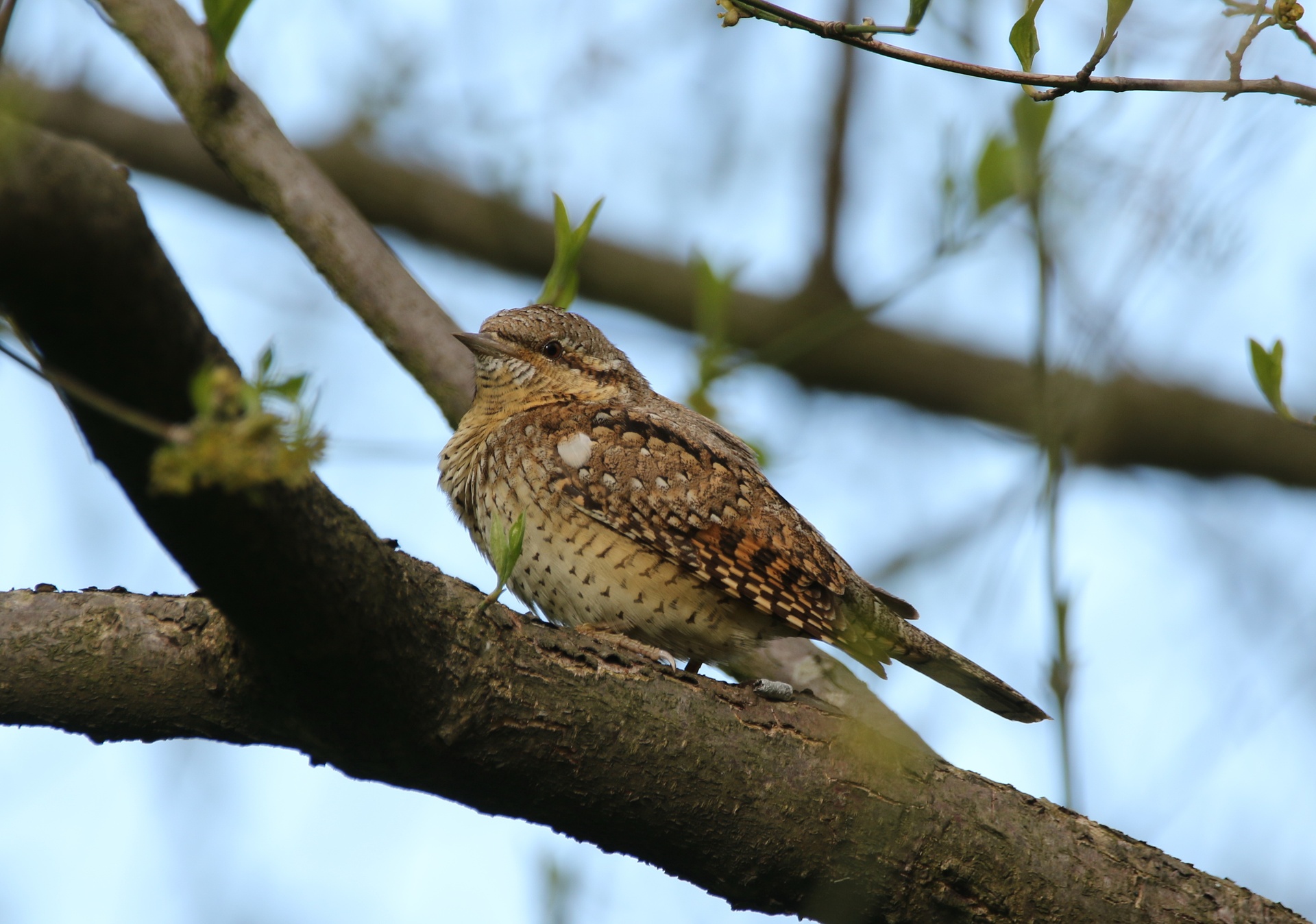 Fa 16 cm de llargària. Té un plomatge de colors apagats, gris i bru amb taques blanques per damunt i ratllat finament per sota. Té la cua llarga i arrodonida el bec curt, recte i punxegut, les potes molt curtes amb dos dits endavant i dos endarrere; la llengua llarga, viscosa i protràctil.