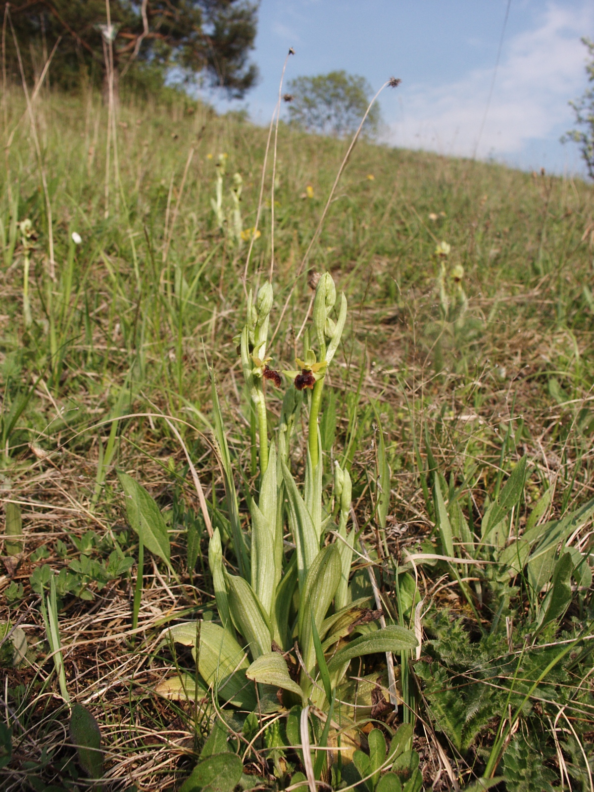 Ophrys sphegodes és una orquídia terrestre que té tubercle subterrani, globular i petit, del qual surt la tija floral erecta senzilla i sense ramificacions, d'uns 30 cm. Aconsegueixen una alçària de 25 a 30 cm. Les petites fulles basals formen una roseta de fulles enganxades arran de terra, oblongolanceolades arrodonides sense indentacions, tenen un color verd blavós. Les flors tenen un label de grans dimensions. El label és trilobulat d'un color marró fosc, amb lòbul central vellutat, triangular, allargat i bombat. El label de color marró vermellós, d'uns 13 a 18 mm de longitud, té tres lòbuls amb els dos laterals triangulars que estan girats lleugerament cap endavant, amb uns pèls fins i sedosos imitant èlitres d'insecte. El lòbul intermedi és glabre i més gran que els laterals, en el qual l'espècul és de color acer o una mica purpuri, amb forma de H o de lletra "pi" grega. Aquesta varietat té dos sèpals laterals iguals en grandària, el tercer es gira una mica cap endavant. Els tres sèpals són d'uns 7 mm de longitud i un color uniforme verd vermellós o verd. Els tèpals interns són bastant més petits que els externs, estrets i afilats (imiten les antenes d'un insecte), però del mateix color verd que els sèpals, i fan un gran contrast amb els tons foscos del label. De dos a deu flors es desenvolupen en la tija floral amb fulles basals. Les flors són úniques, no solament per la seva inusual bellesa, gradació de color i formes excepcionals, sinó també per la ingenuïtat amb la qual atreuen els insectes. El seu label imita en aquest cas l'abdomen d'una aranya. Aquesta espècie és molt variable en els seus dibuixos i gradació de color.
